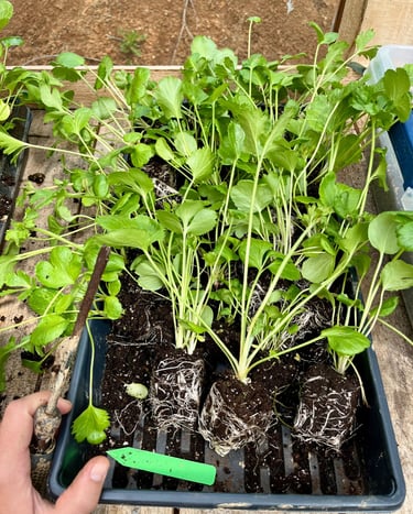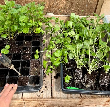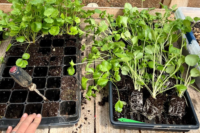 Transferring the transplants to a tray before taking them out to the premade holes in the ground.