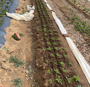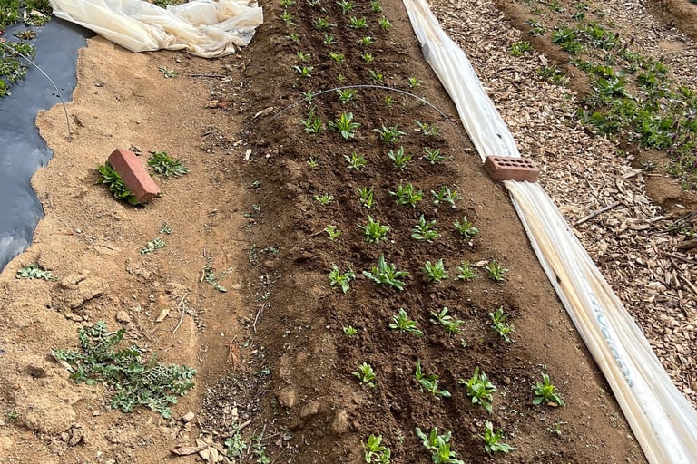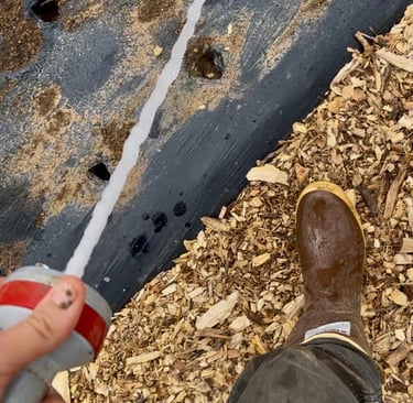 To take advantage of convenience, before I put down the biodegradable weed barrier, I go ahead and take in my organic fertilizer. This is much quicker than trying to add it to the individual holes you make for each transplant.